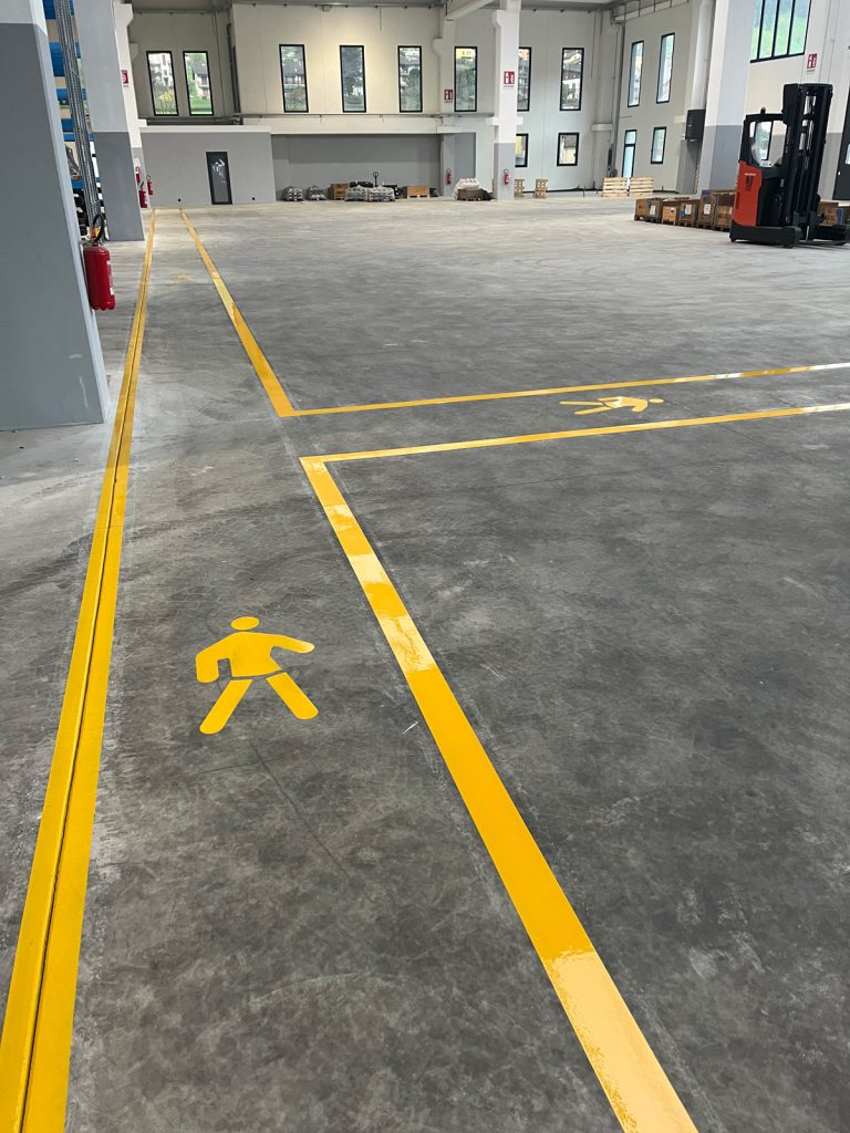 - Verniciatura pavimenti industriali per linee di demarcazione e sicurezza.